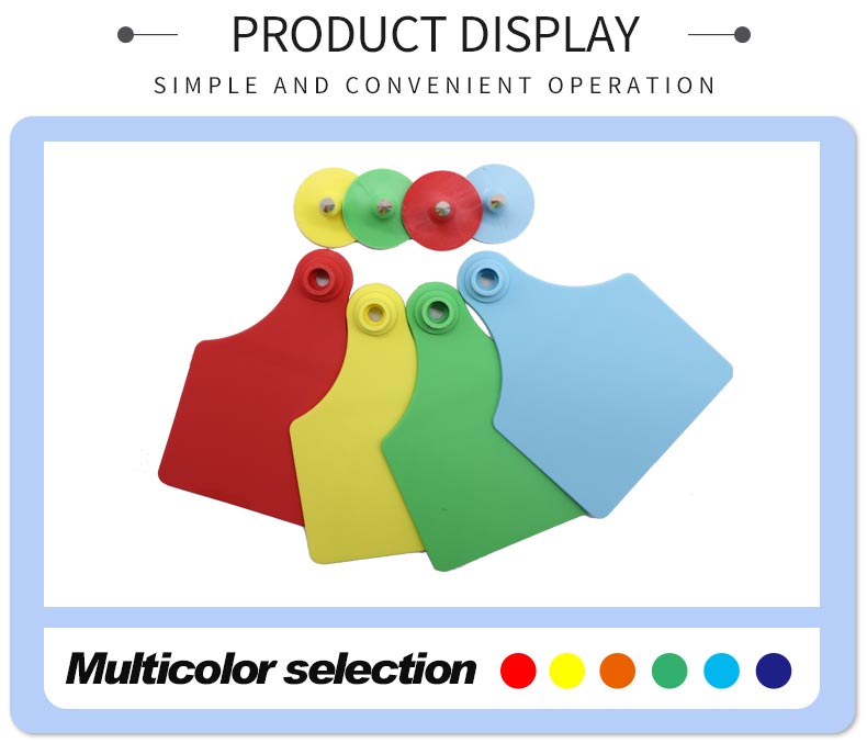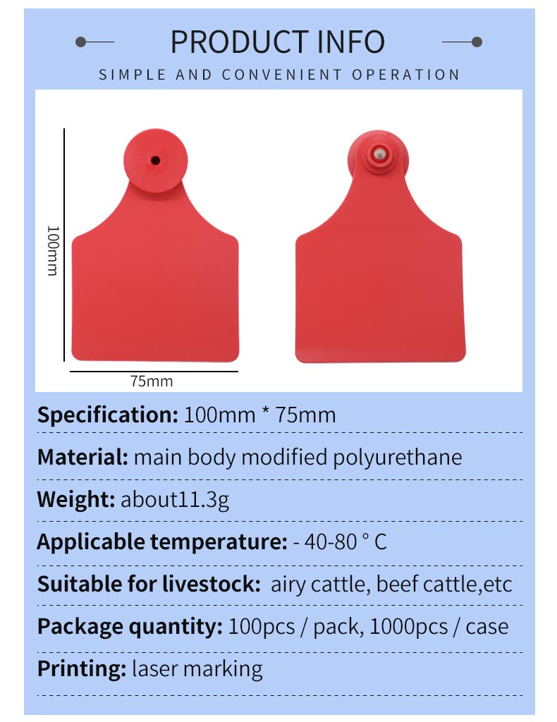 Tamper proof livestock blank cattle ear tags Material TPU Color Yellow,White,Blue,Green,Red,Orange and so on Imprinting Laser engraving/Hot stamping Application Cattle MOQ 100pcs Certificate ISO9001, ISO14001, OHSAS Samples Avilable Packing 100 pcs/pack, 25 bags/carton can be customized Animals ear tag Product advantages 1. Ear tags is applied in breeding population, epidemic prevention and control, meat quarantine,All the field of information management for animals and livestocks. 2. The ear tags is marked by laser engraving, has never decolorization effect. 3. Imported material can be cold antifreeze heat.(TPU material), ear plate and ear tag clamp used together 4. high quality stud earrings, not easy to loose, no corrosion, never rust 5. Bold font, more eye-catching easy to distinguish